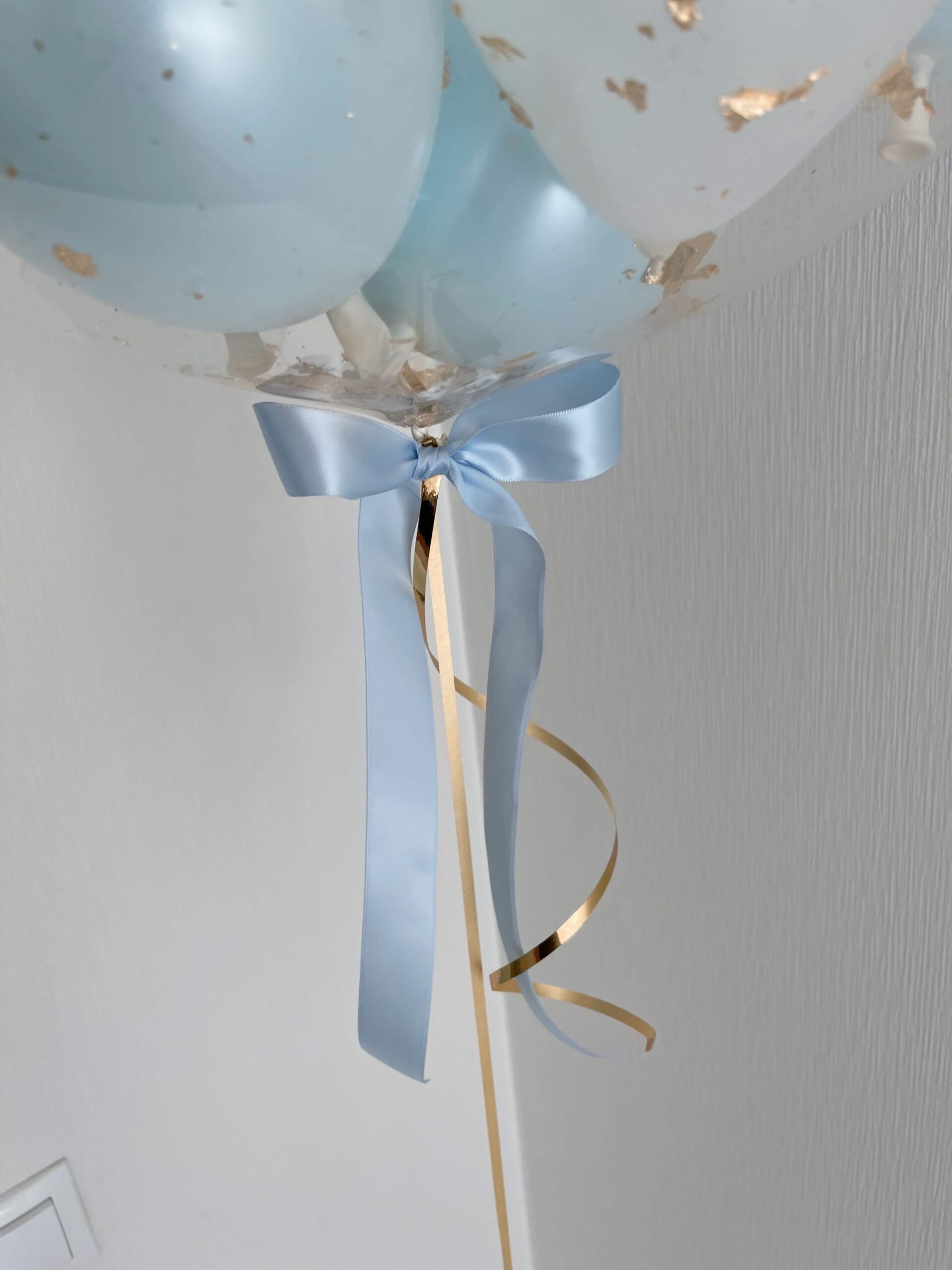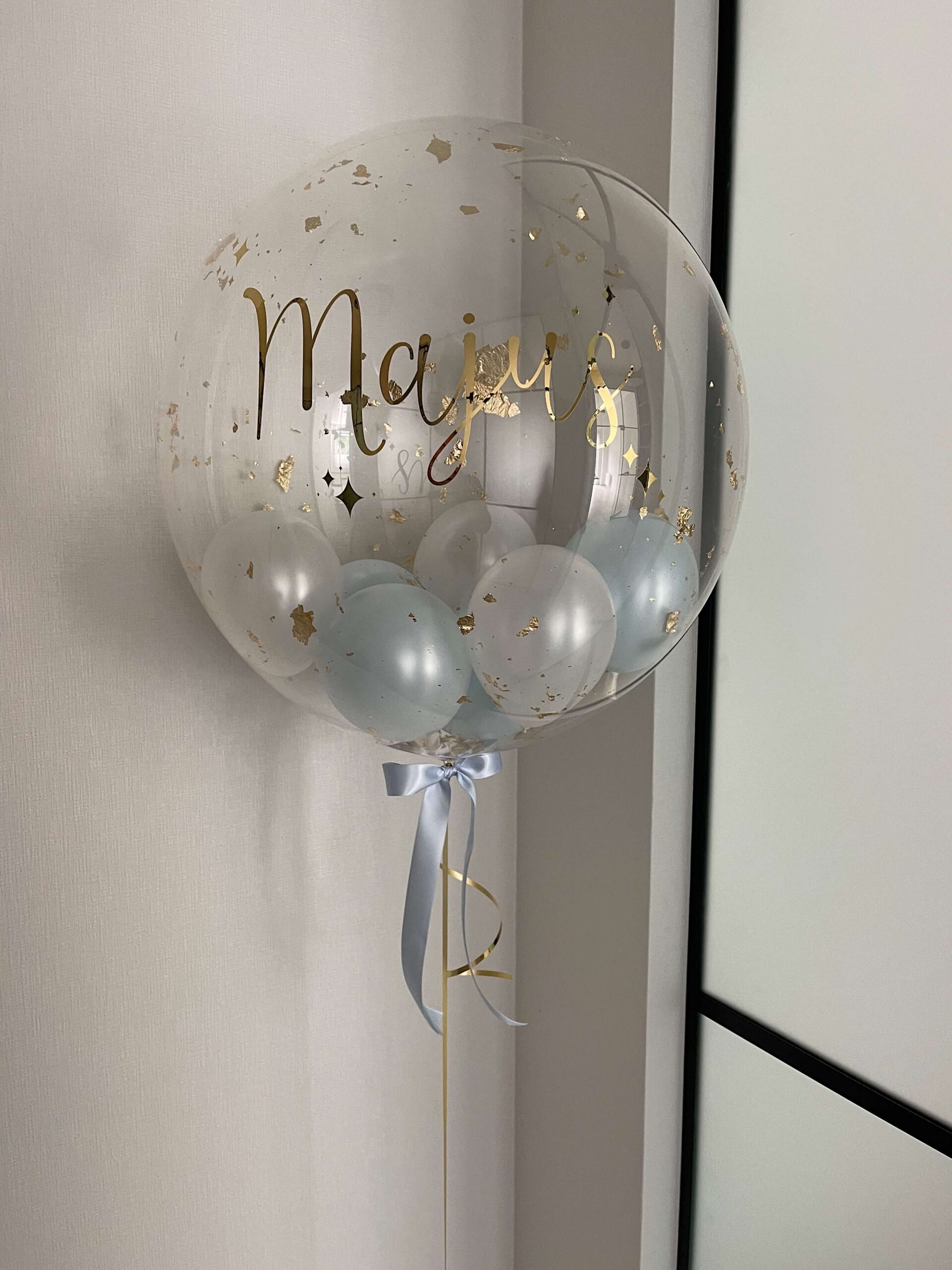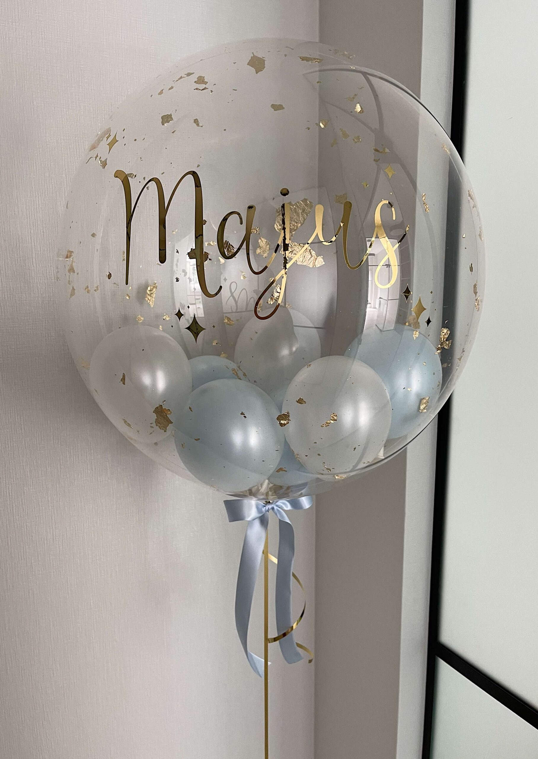 Viduje baliono pridedame 12cm mažesniu balionėlių su baltais, perlines žydros spalvomis ir auksines folijos drožlėmis. Mergaitėms galima iškeisti žydra spalva į švelniai rožine.
