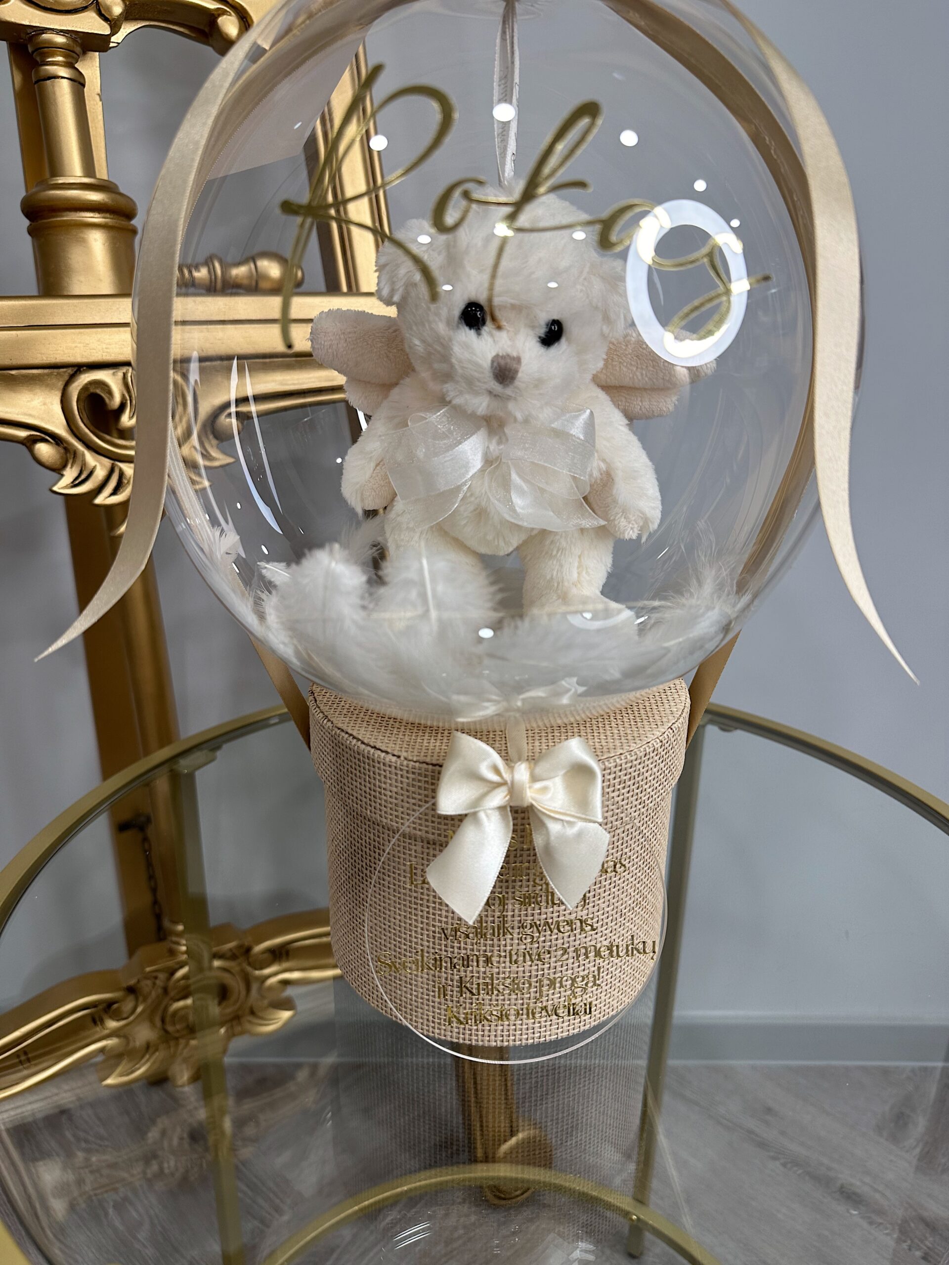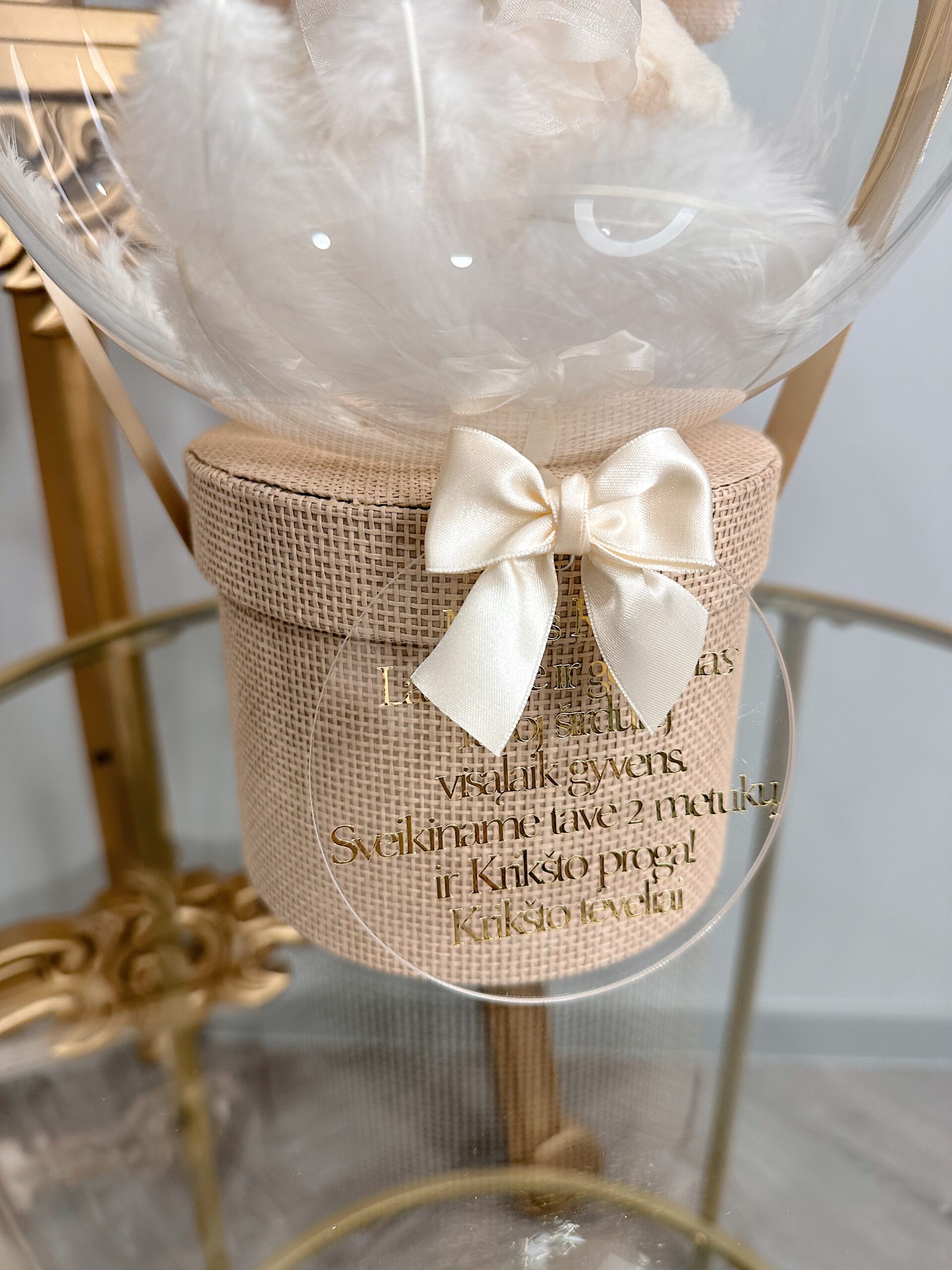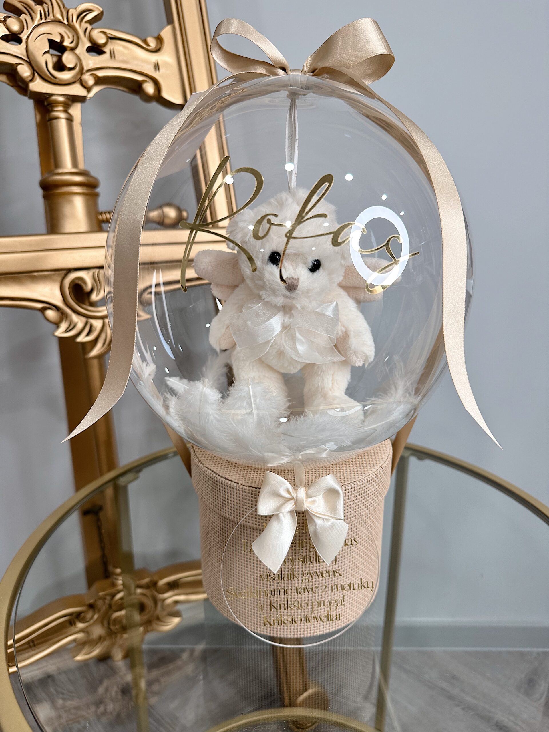 Ant baliono vaikučio vardas ar norimas užrašas iki 35 raidžių, taip pat galite pridėti gražų palinkėjimą ant akrilo stiklo diskelio iki 65 raidžių.