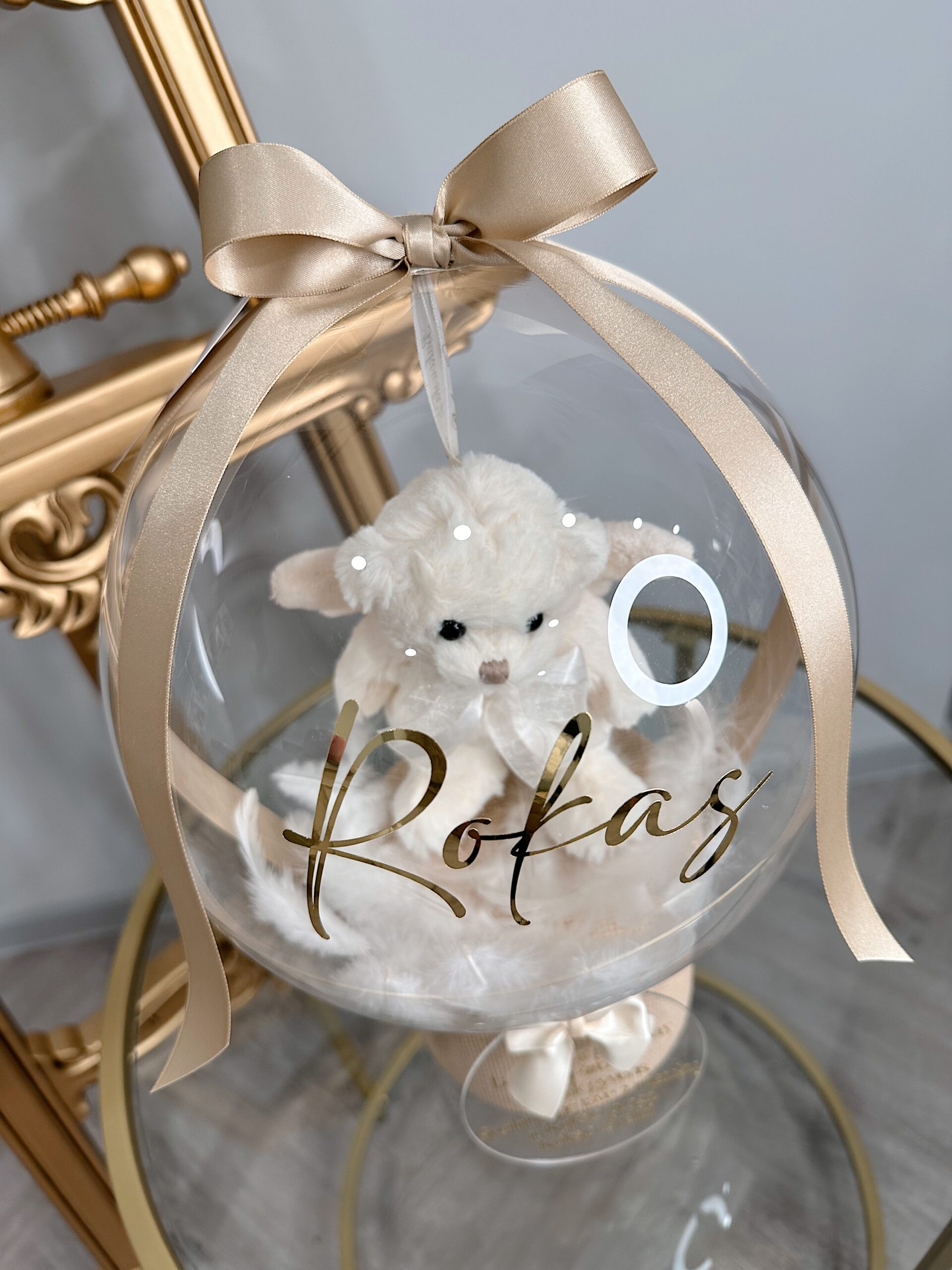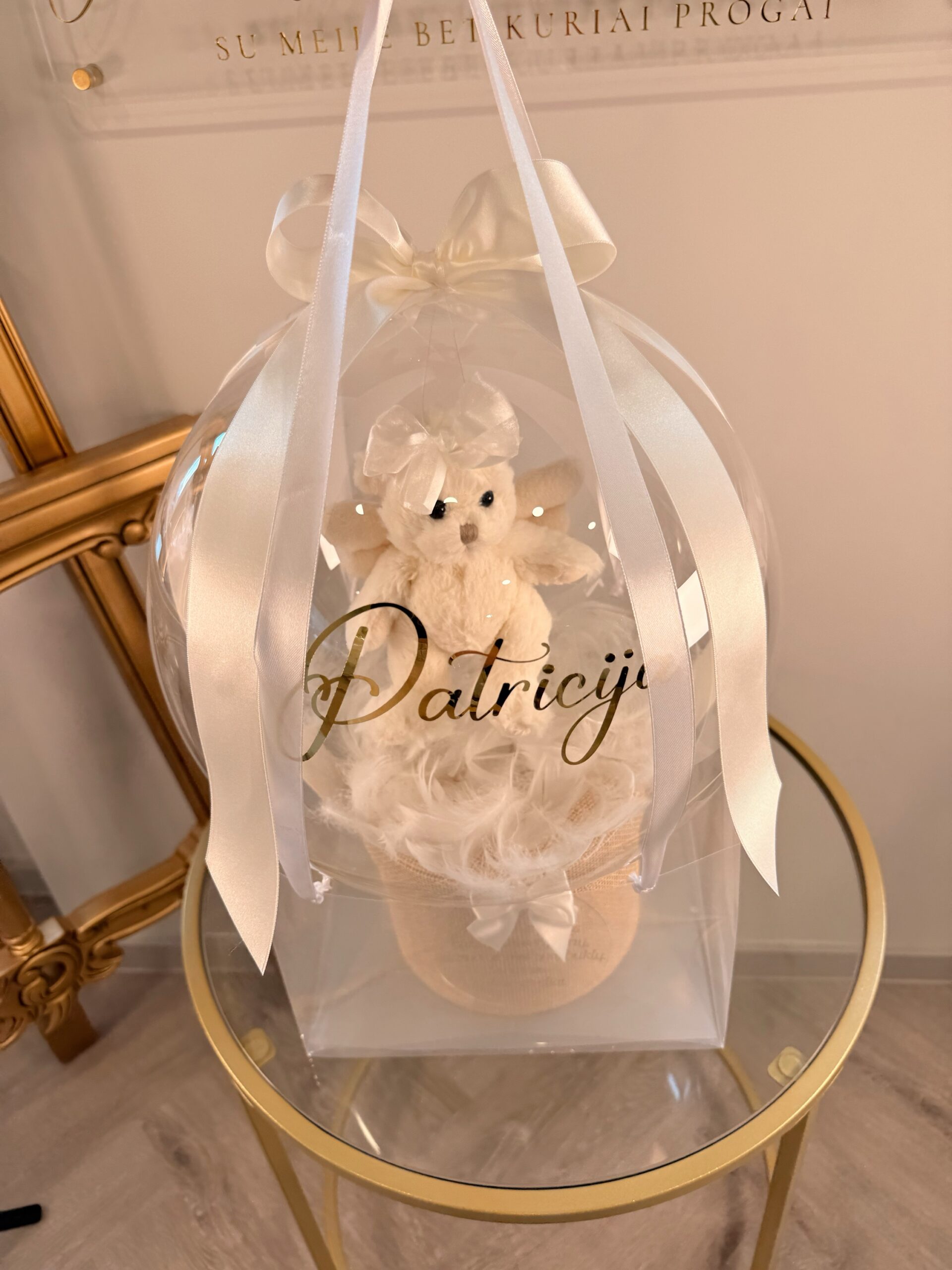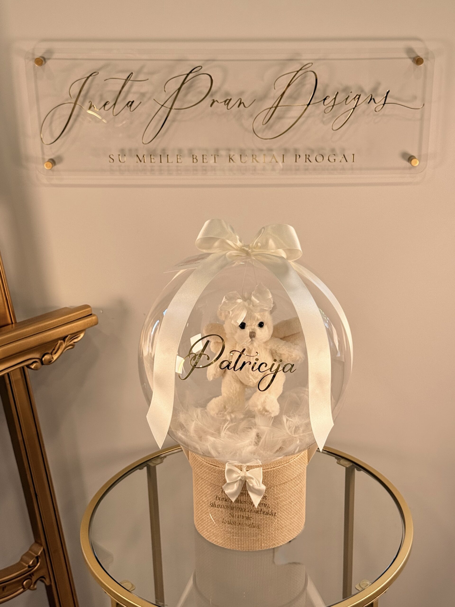 Ant baliono vaikučio vardas ar norimas užrašas iki 35 raidžių, taip pat galite pridėti gražų palinkėjimą ant akrilo stiklo diskelio iki 65 raidžių.