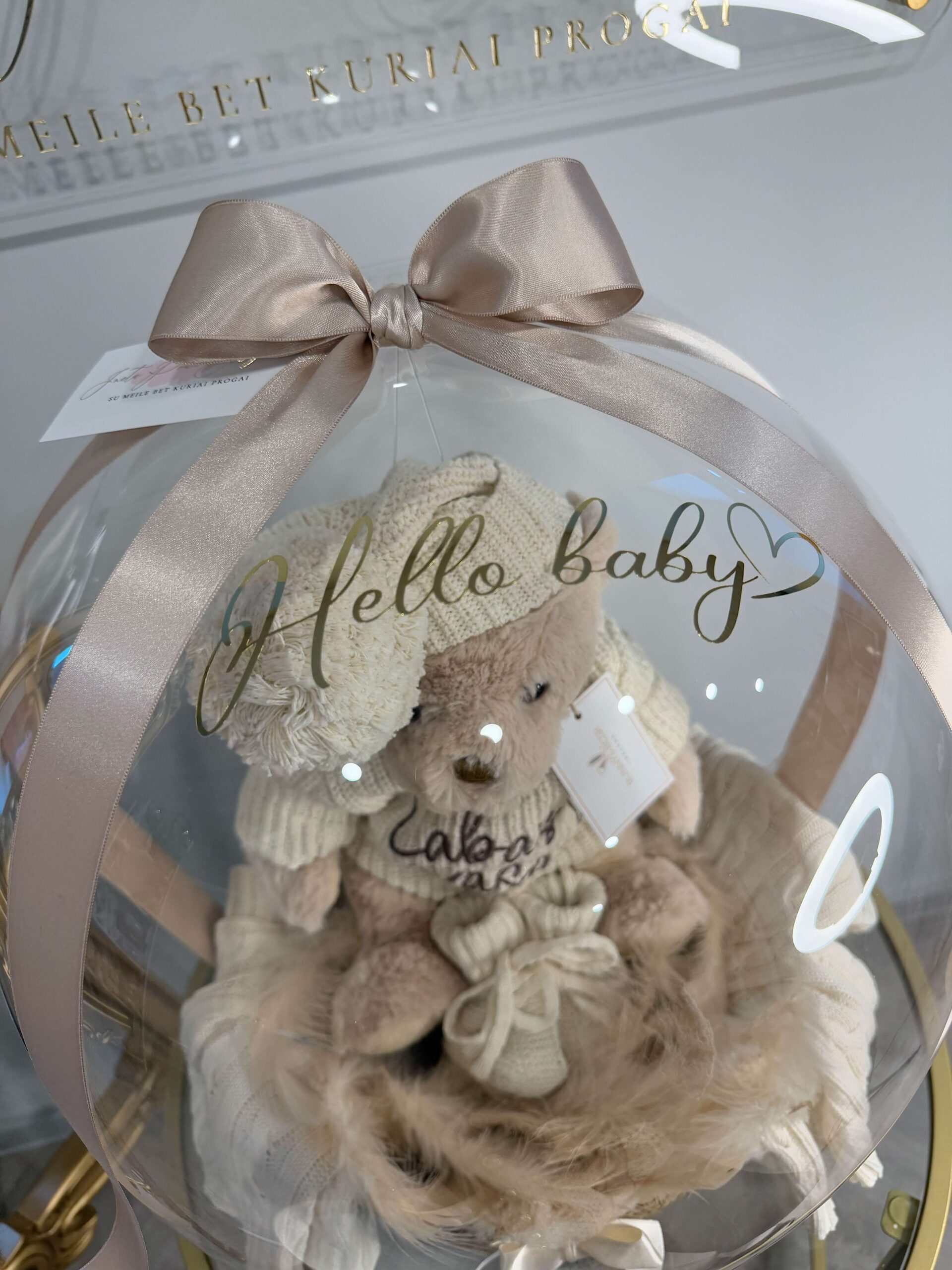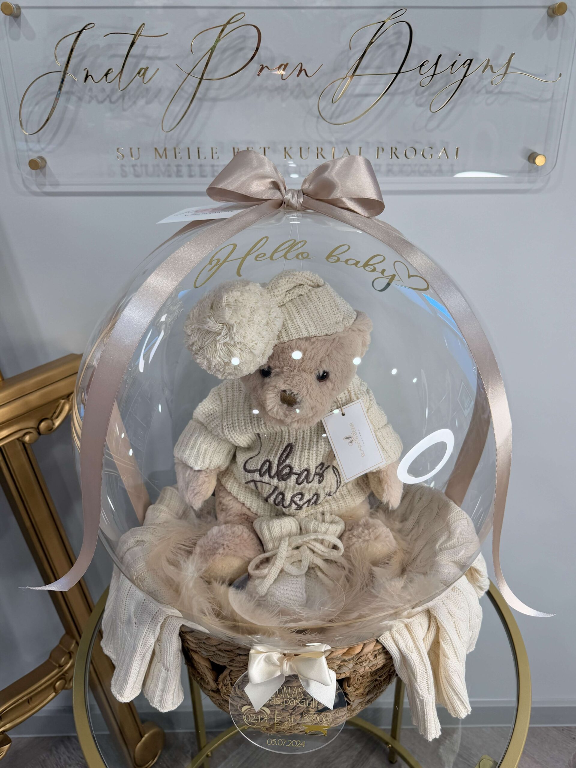 Dovaną sudaro kokybiškas pliušinis meškutis pasipuošęs  personalizuotu megztu šliaužtinuku “romper” su užrašu “labas, pasauli”, šiltais megztais tapukais ir kepurytė. Visa tai supakuota baliono viduje! Rūbelio dydis 0-6men ir gali būti tobula puošmena gimimo pranešimo fotosesijoje.