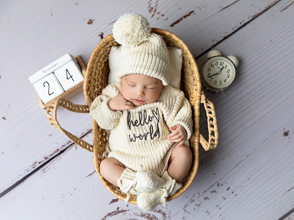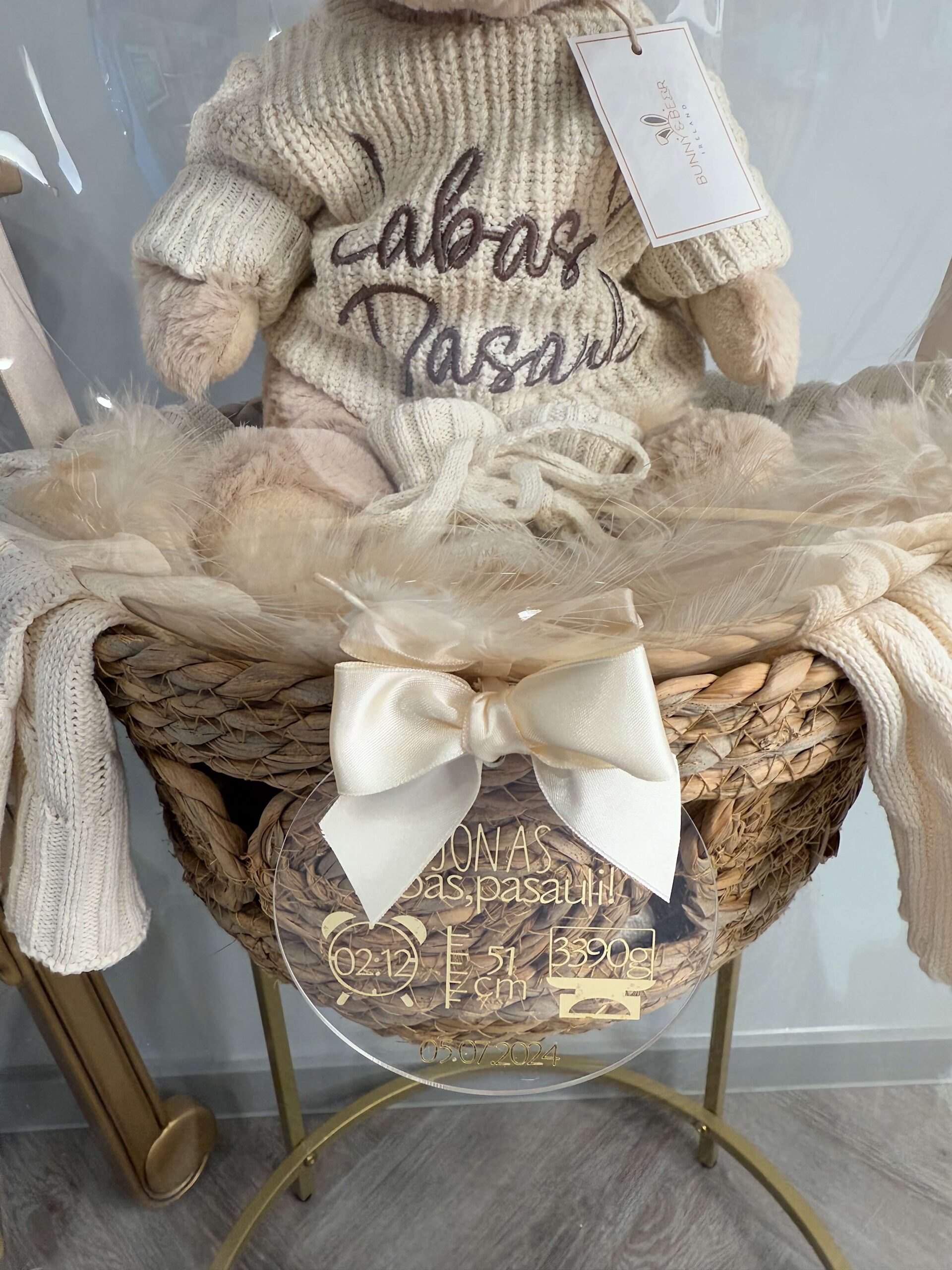 Prie dovanos taipat yra gražus pintas krepšelis ir šiltas pledukas. Už papildomą mokestį pridėkite vaikučio gimimo informaciją ar norimą palinkėjimą ant akrilo stiklo diskelio iki 65 raidžių.