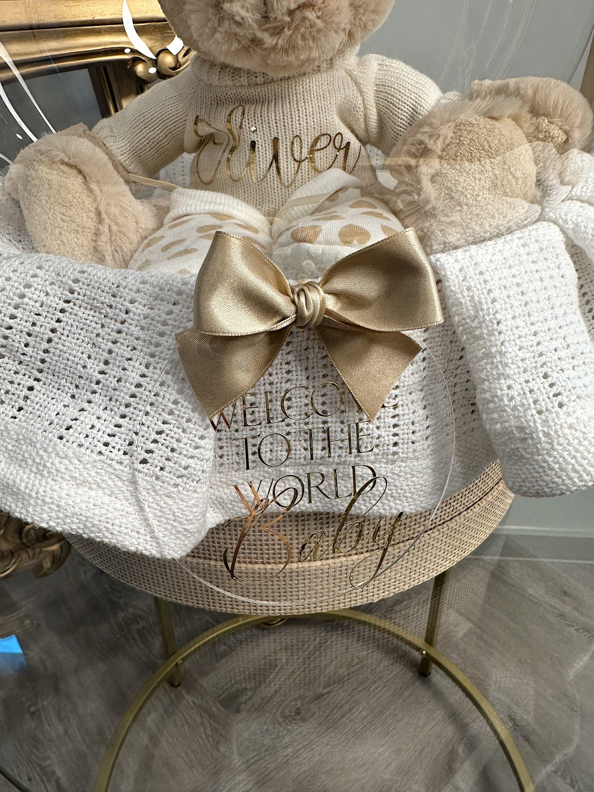 Kas ijeina: aukštos kokybės pliušinis meškutis (su personalizuotu megztinių vaikučio vardu), tapkutes (0-6men), medvilninis pledukas ir dėžute su dangteliu.