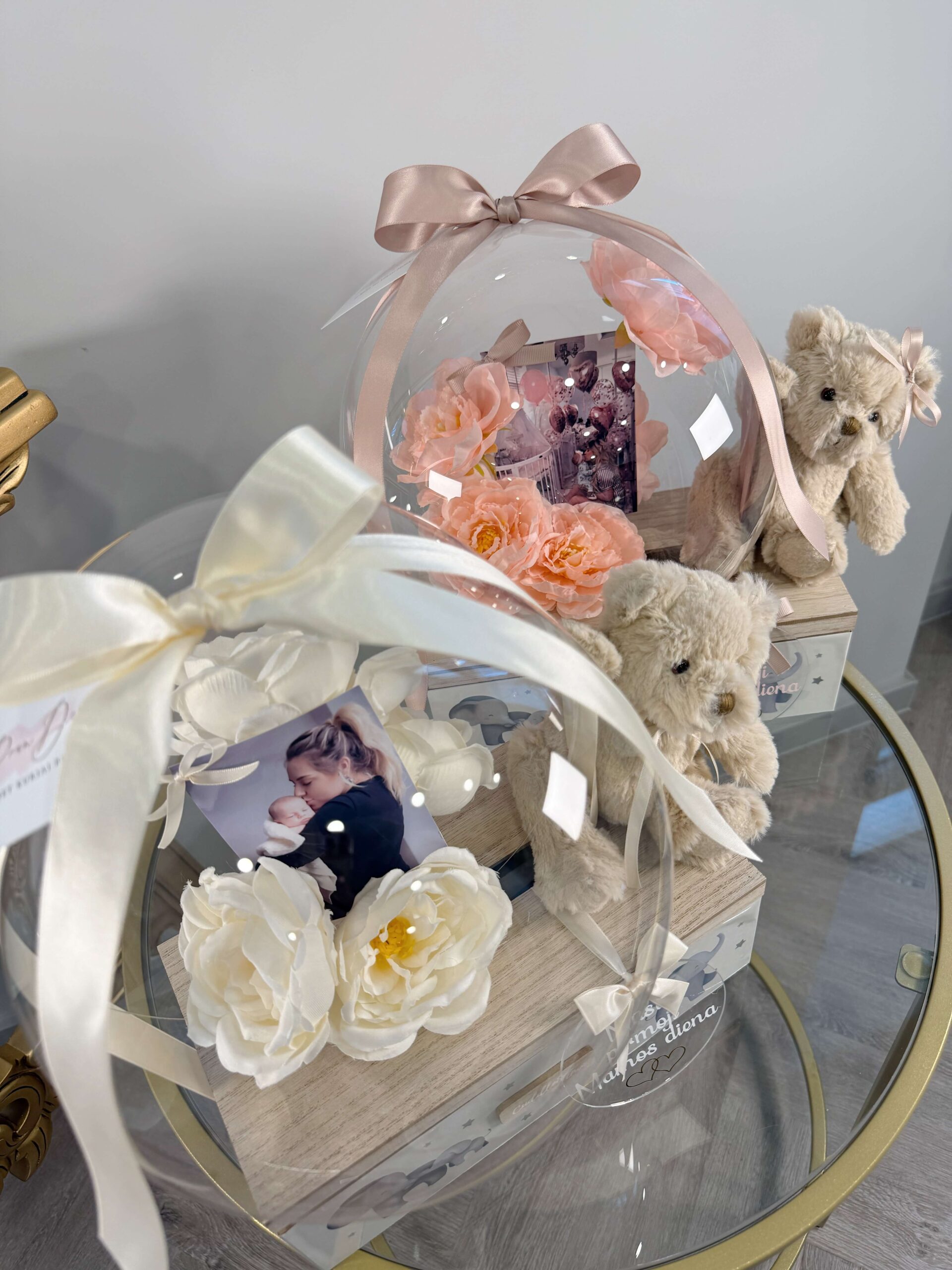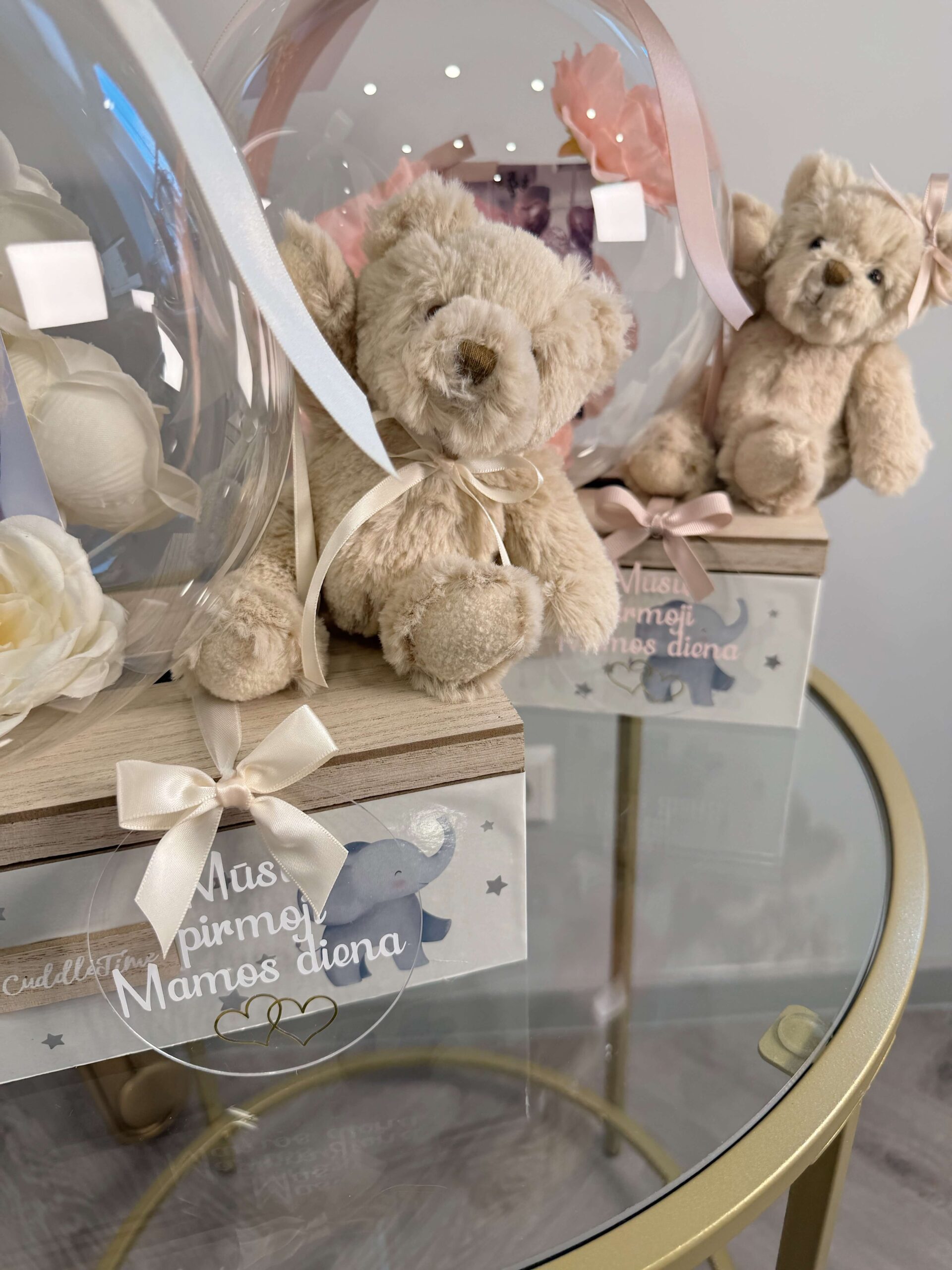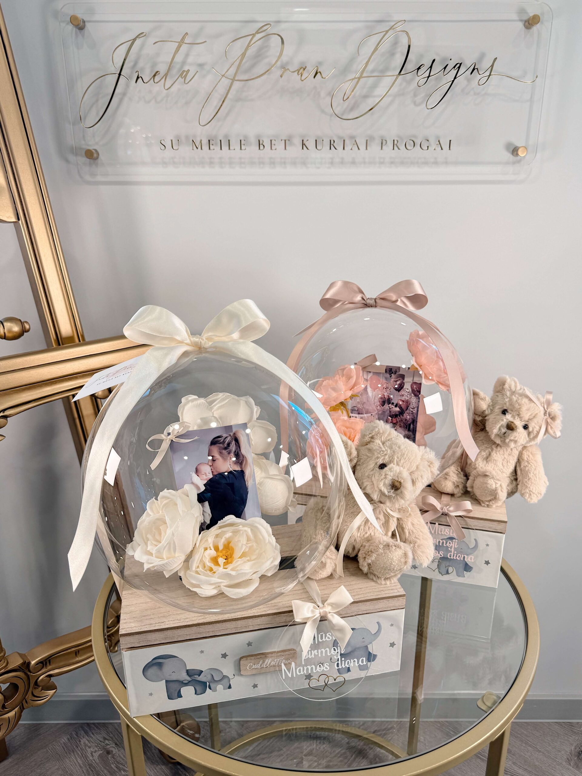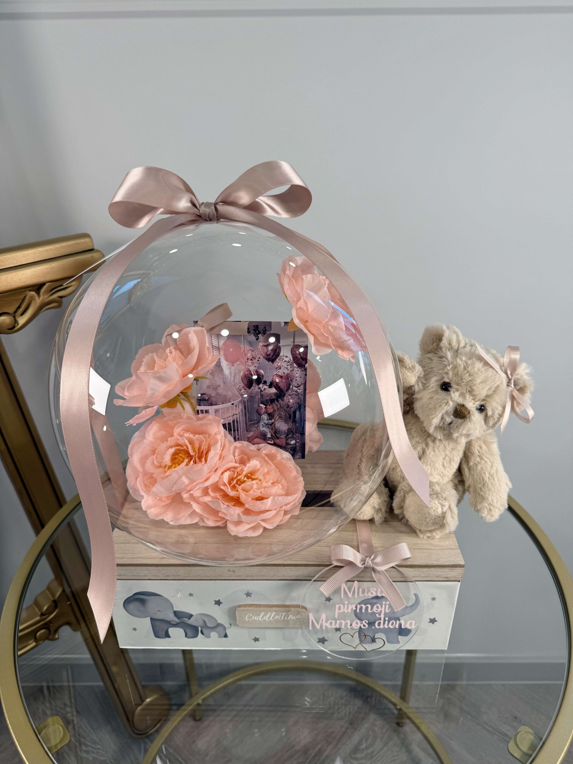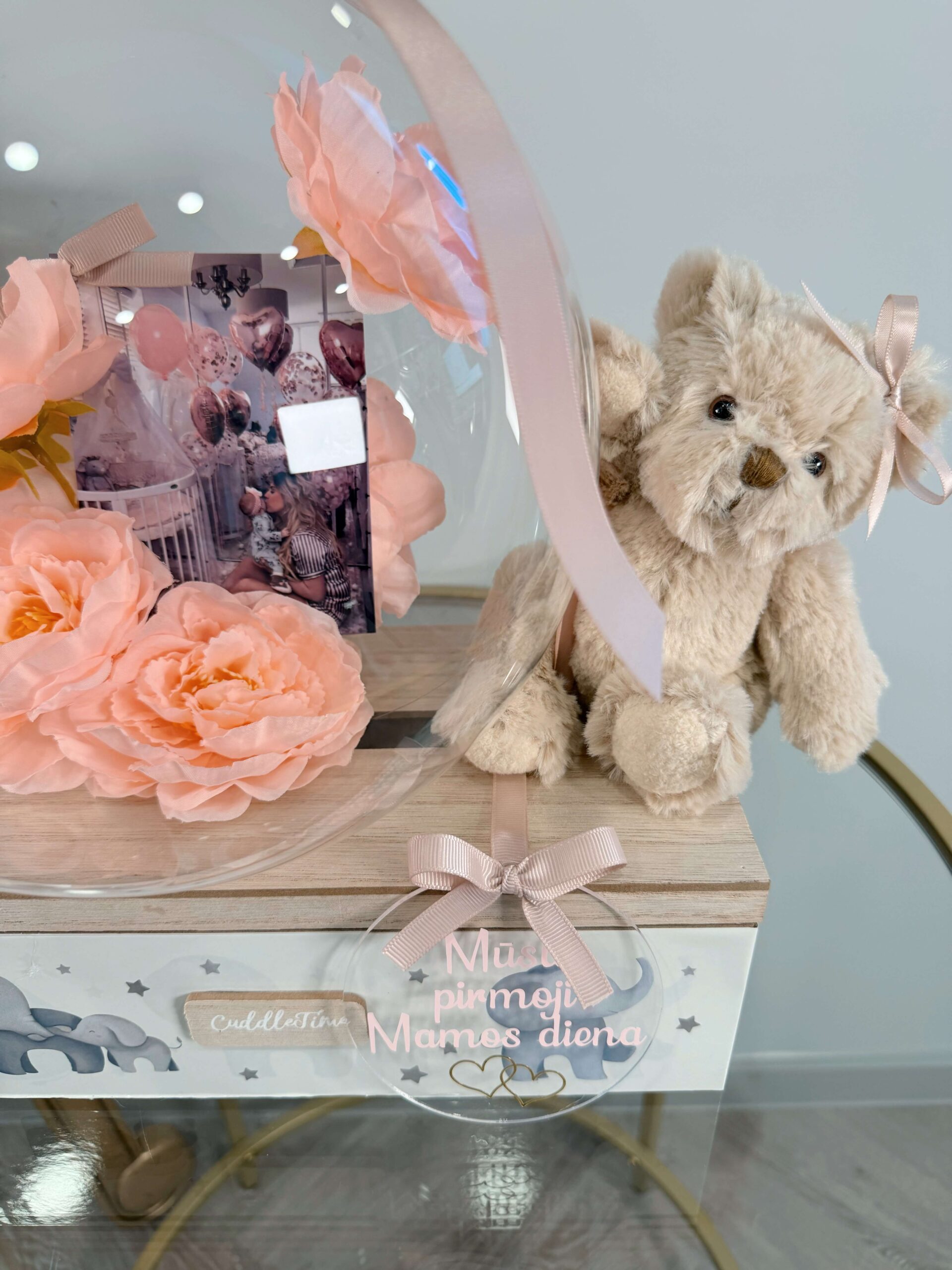 Ši dovanėlė skirta mamytėms kurios švęs savo pirmąją Mamos dieną! Baliono viduje tarp gėlyčių jūsų norimą nuotrauką, prie balionėlio meškutis kuris bus mielas šios progos prisiminimas!