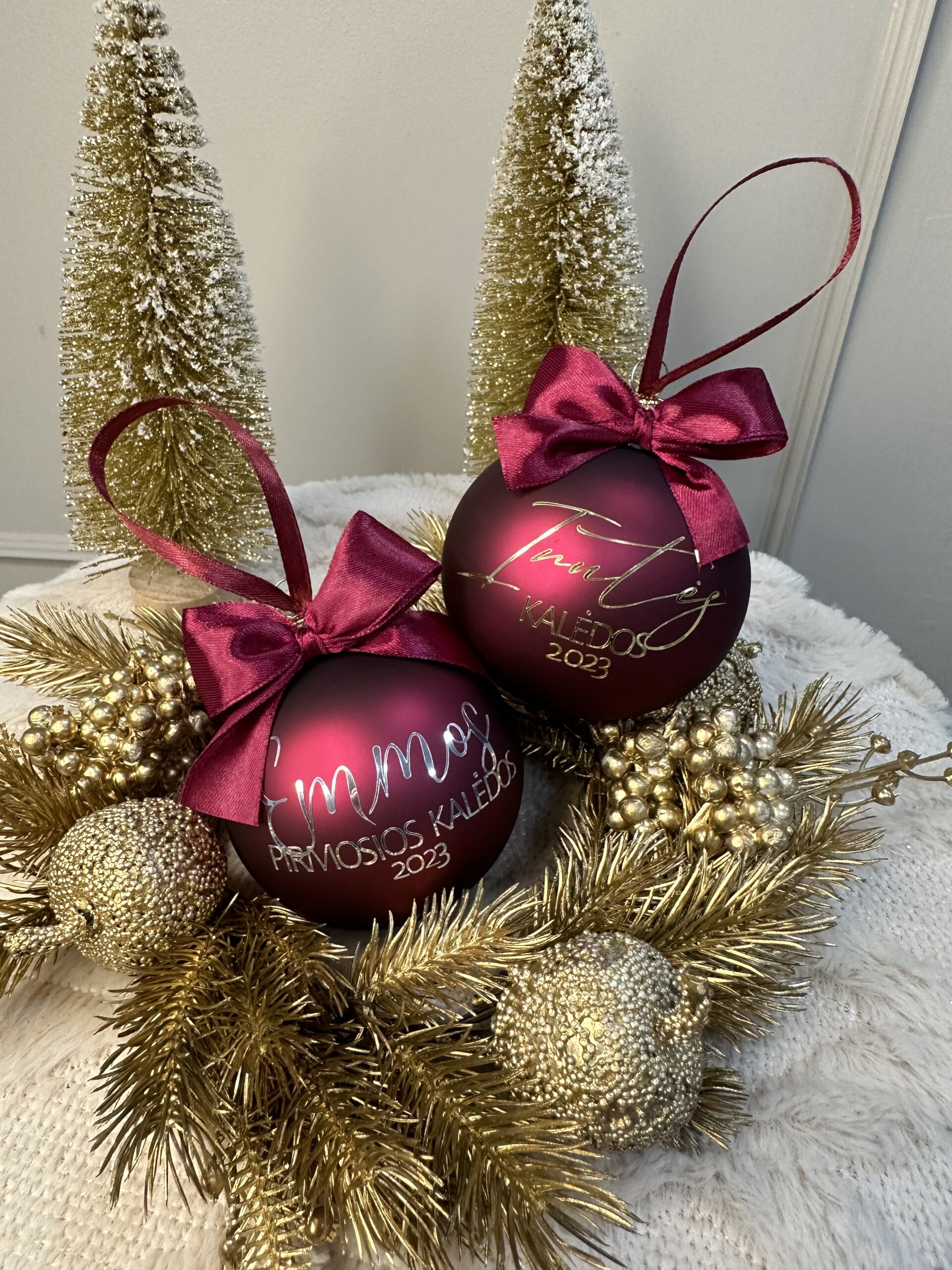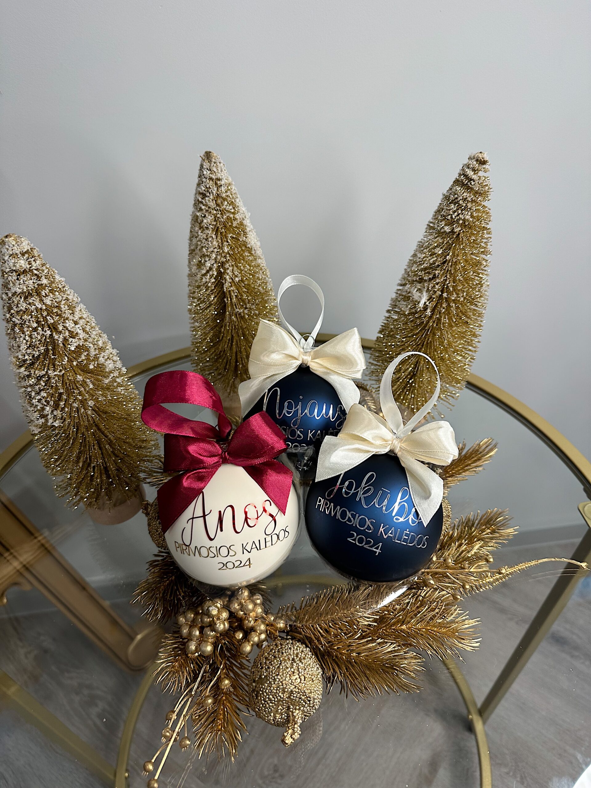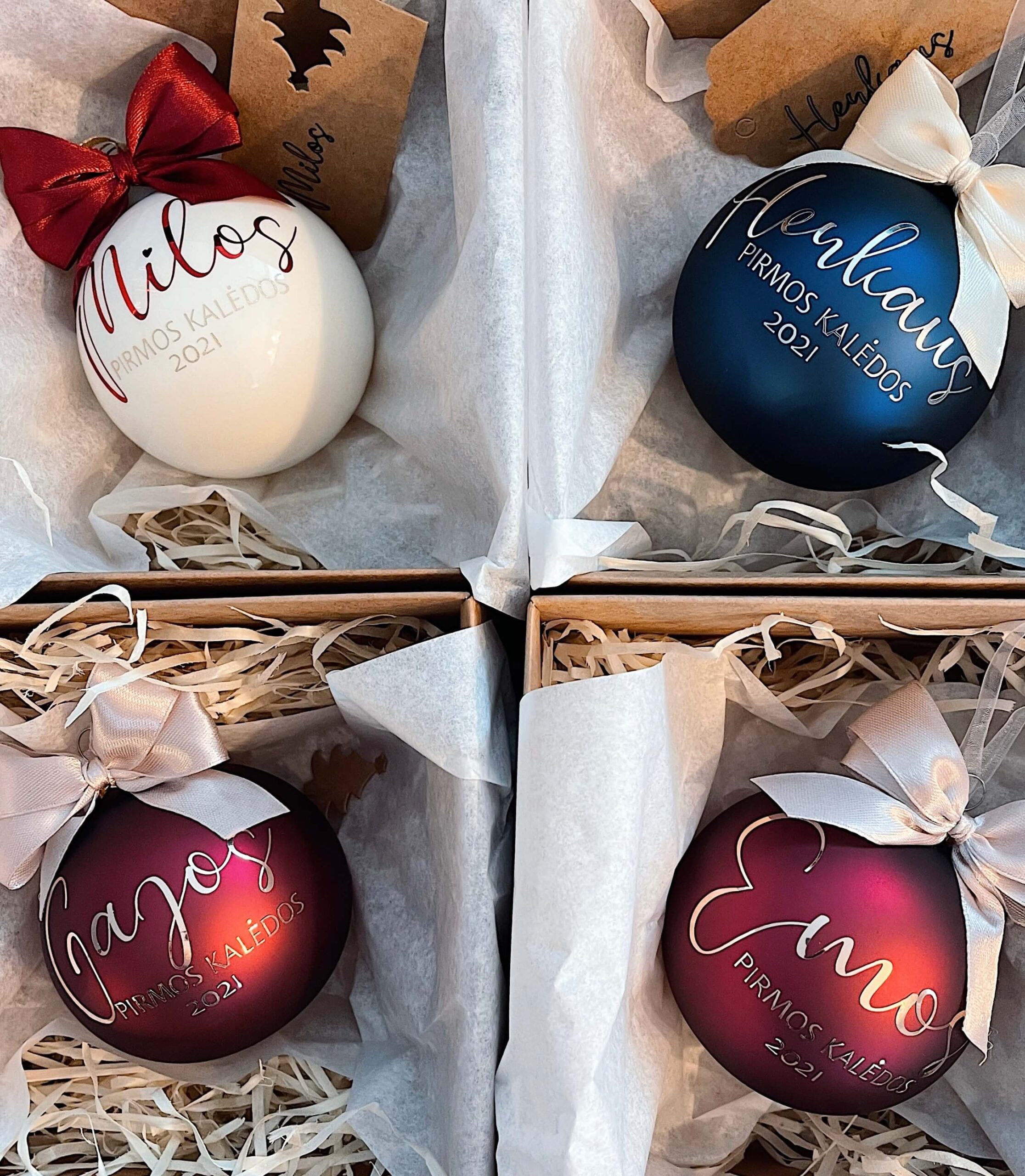Žaisliukai pagaminti iš kokybiško stiklo, skersmuo 9cm ir visi supakuoti atskirai kaip dovaną. Tai simboliška bet be galo asmeniška Kalėdų dovaną.