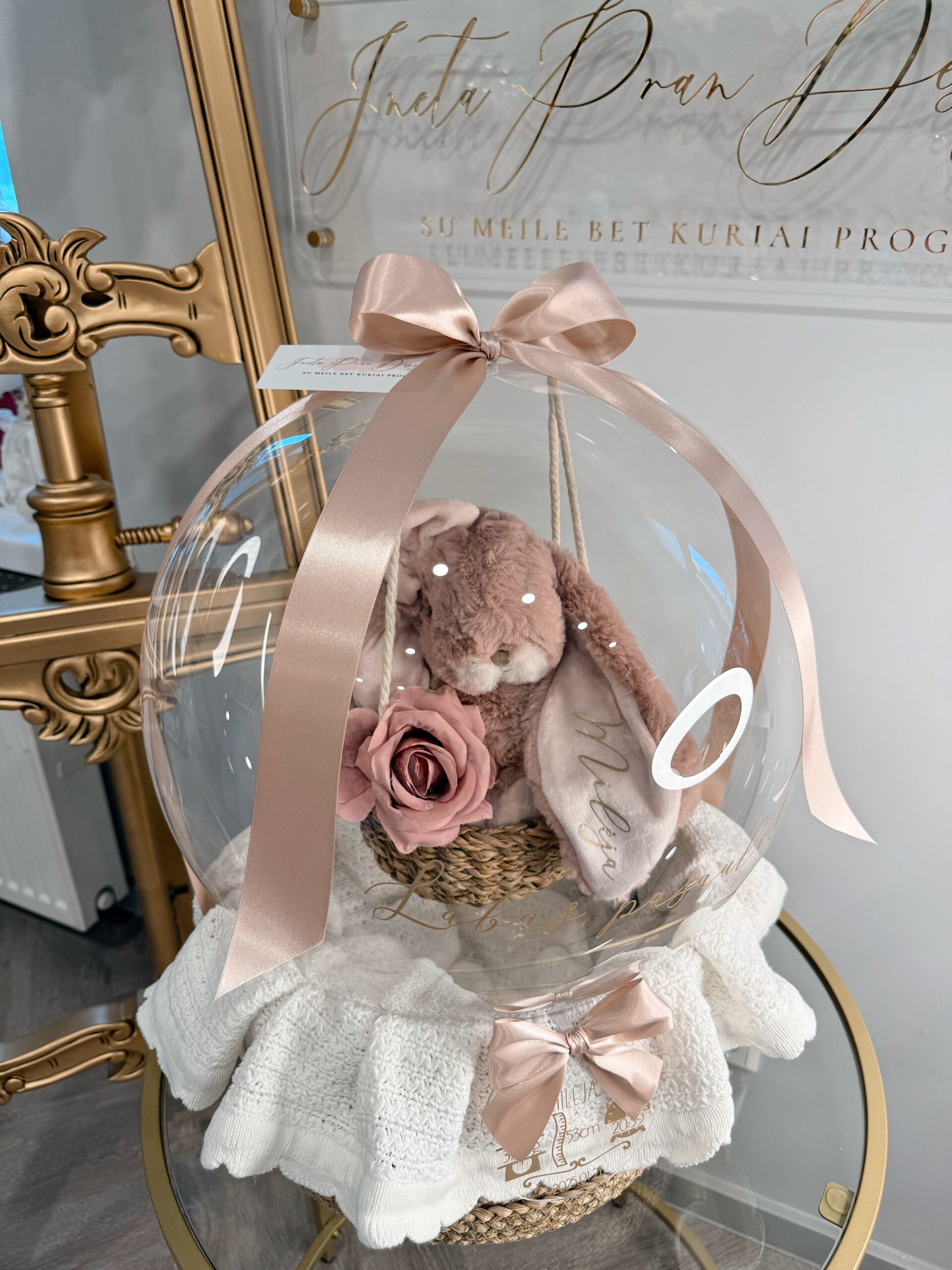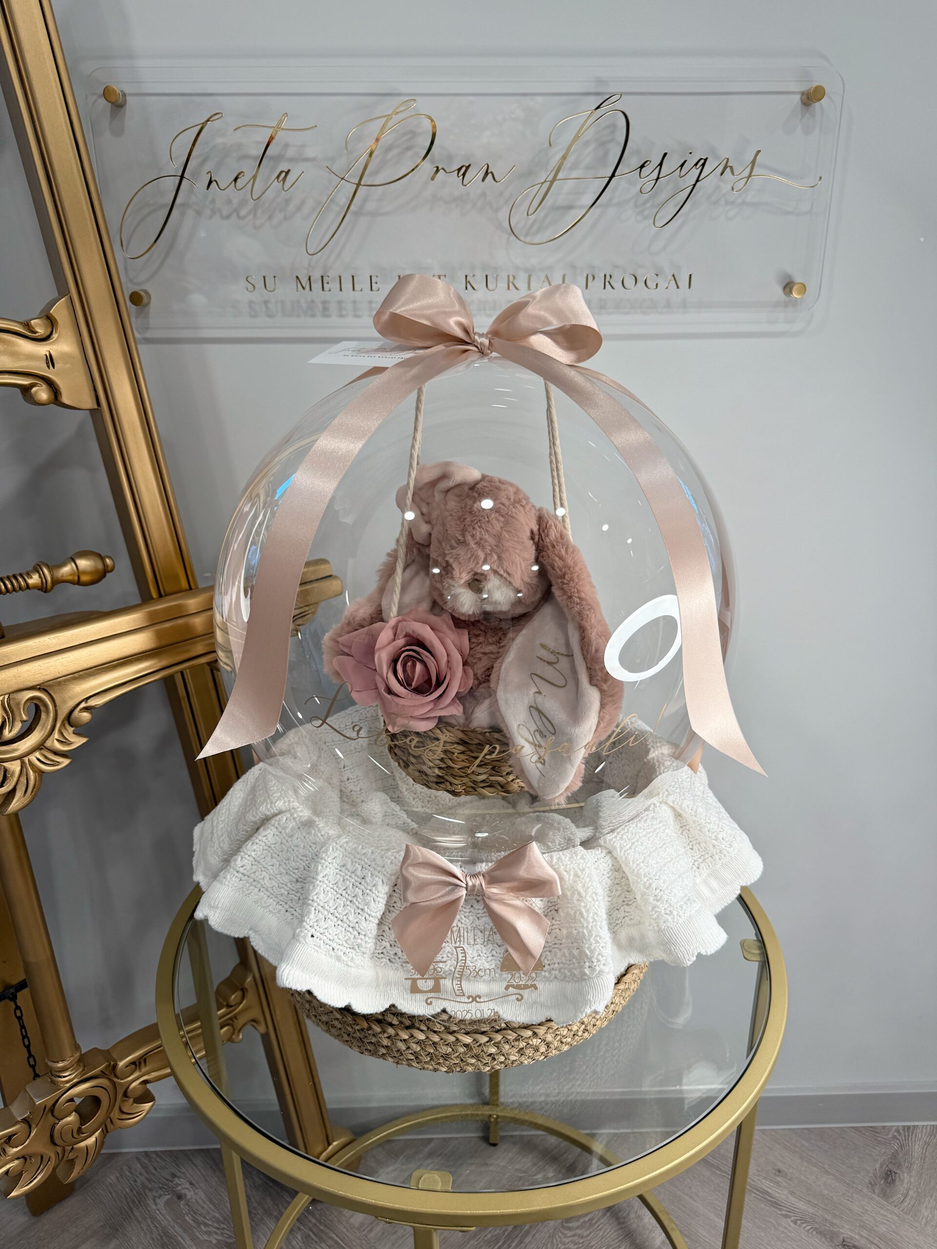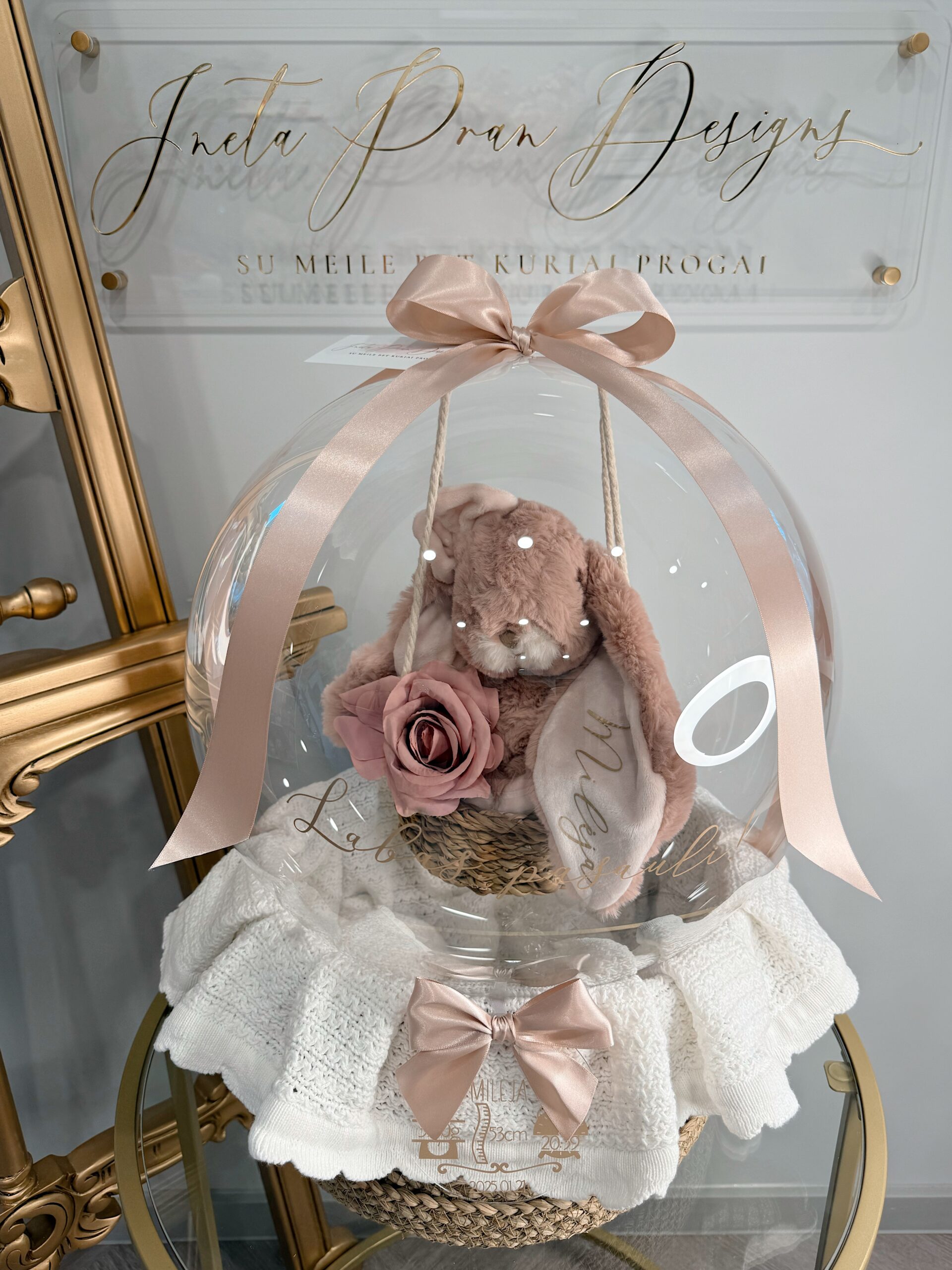 Personalizuokite balioną su norimų užrašu kaip “Labas, pasauli”. Už papildoma mokestį galite pridėti palinkėjimą ar gimimo informacija ant akrilo stiklo diskelio.